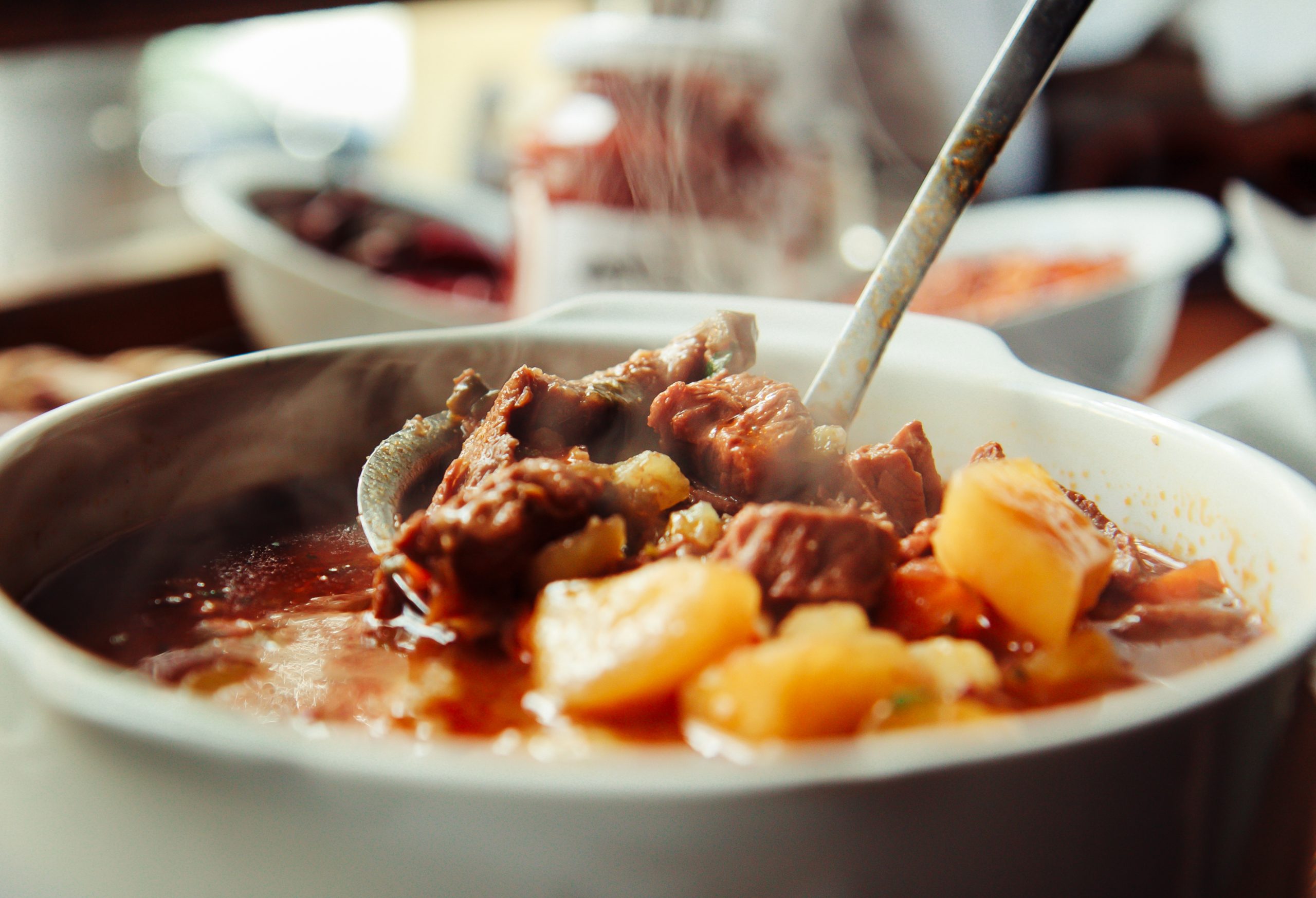 מוסיפים לבשר הצרוב את הבצל ומטגנים 2 דקות נוספות, מערבבים את הבצל המטוגן עם מיצי הבשר שנשארו בתחתית הסיר. מוסיפים את השום, הגזר ותפו"א ומטגנים 2 דקות נוספות. מתבלים בפפריקה, מלח ופלפל, מטגנים 2 דקות נוספות ומוסיפים את רסק העגבניות שערבבנו מראש בציר או מים. מביאים לרתיחה.